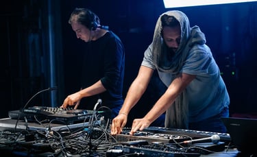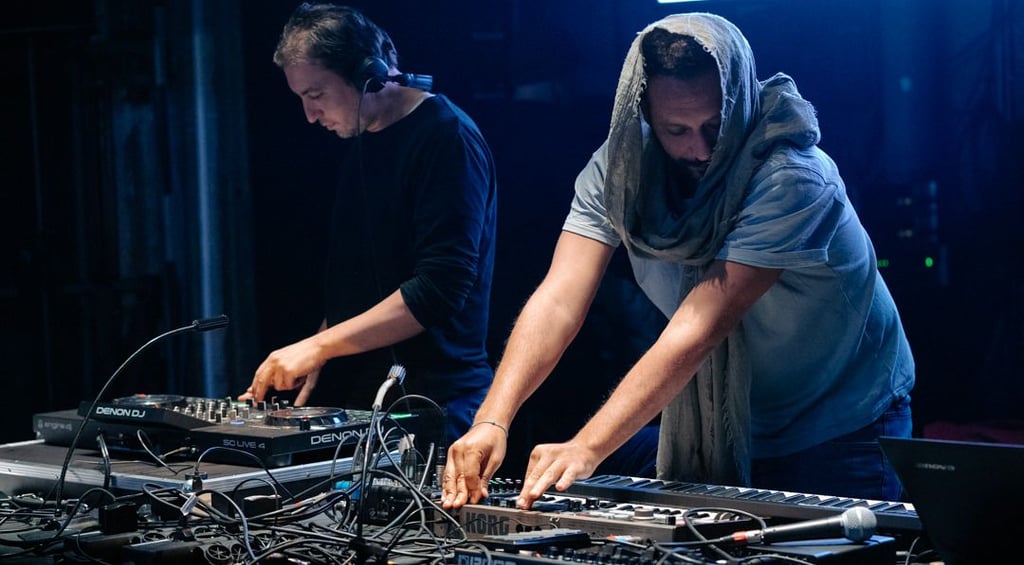 At the heart of this experience is the original music crafted by Cali Kula and Ogra, founders of Wild Bohemia Records. Their sound design oscillates between hypnotic, driving rhythms and atmospheric textures, shaping a sonic journey that fuels the dancers' energy and engages the audience. Ogra, known for pioneering Tunisia’s first electronic music club, manipulates beats and voices live, while Cali Kula, a former radio host, infuses the composition with layered, narrative depth.